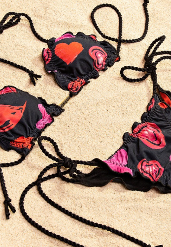 Biquíni preto, com uma estampa delicada e apaixonante de corações vermelhos e rosas. Confeccionado em tecido de alta qualidade, com 84% poliéster e 16% elastano, oferece toque macio, elasticidade na medida certa e ótimo caimento ao corpo.