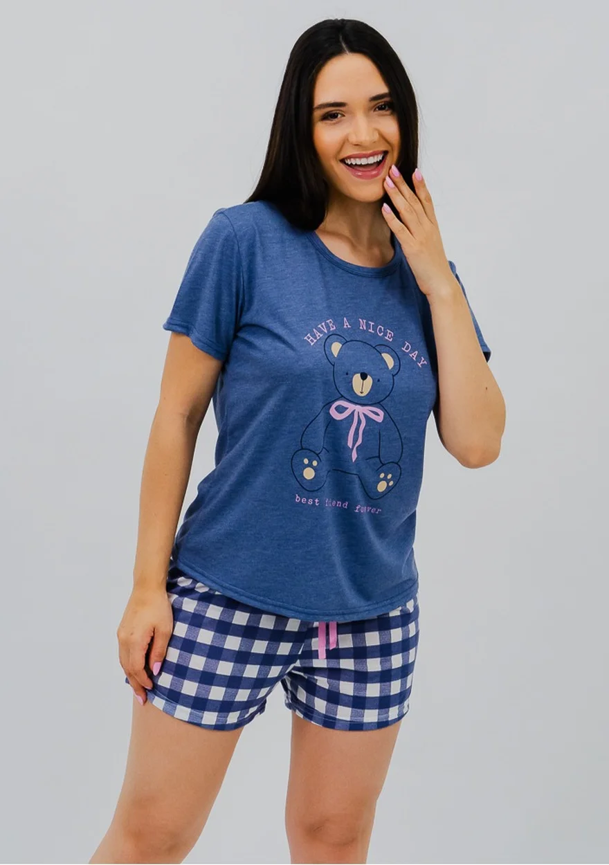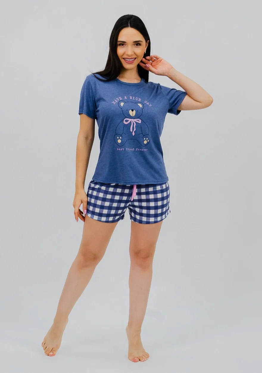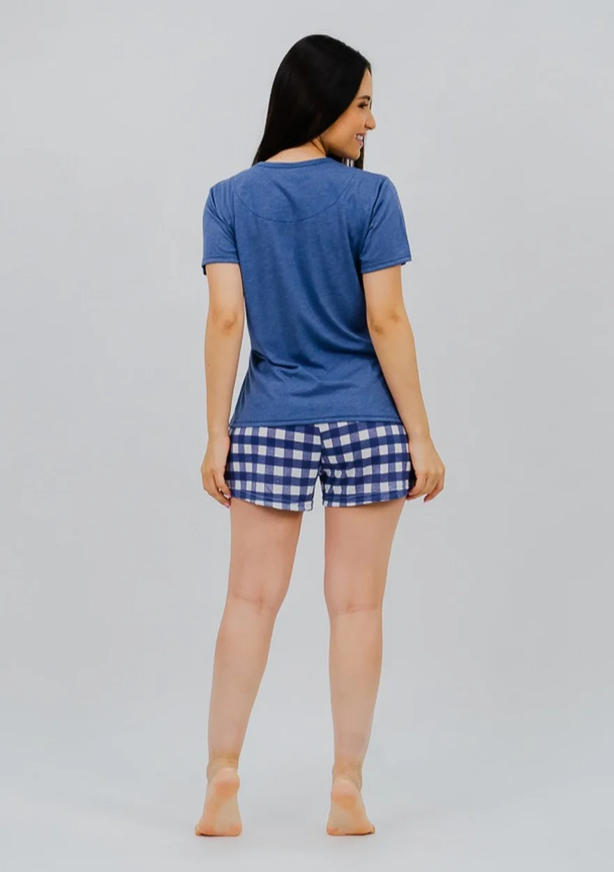 Nosso Pijama é composto por blusa de gola redonda com friso e mangas curtas, e short curto com elástico na cintura e detalhe em cadarço, com corte reto na barra.