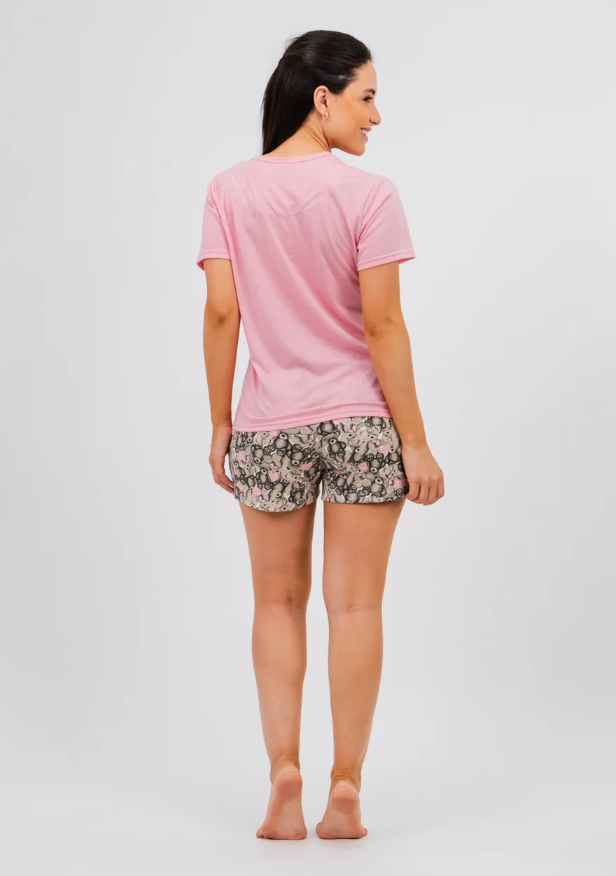 Nosso é composto por blusa de gola redonda com friso e mangas curtas, e short curto com elástico na cintura e detalhe em cadarço.